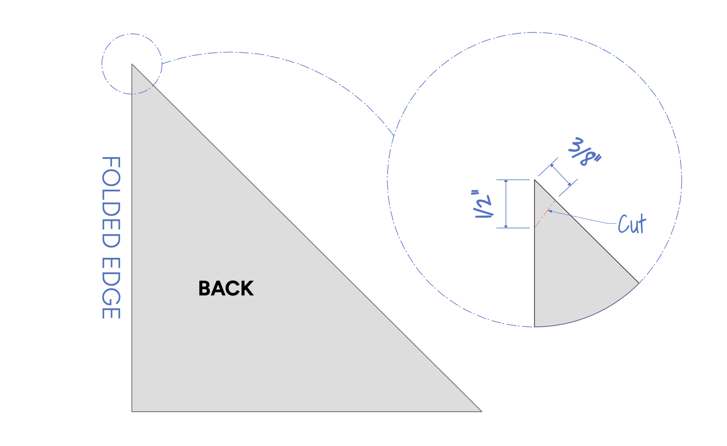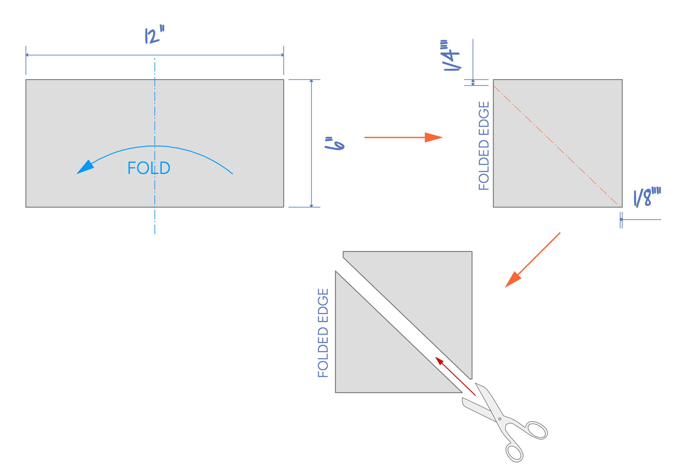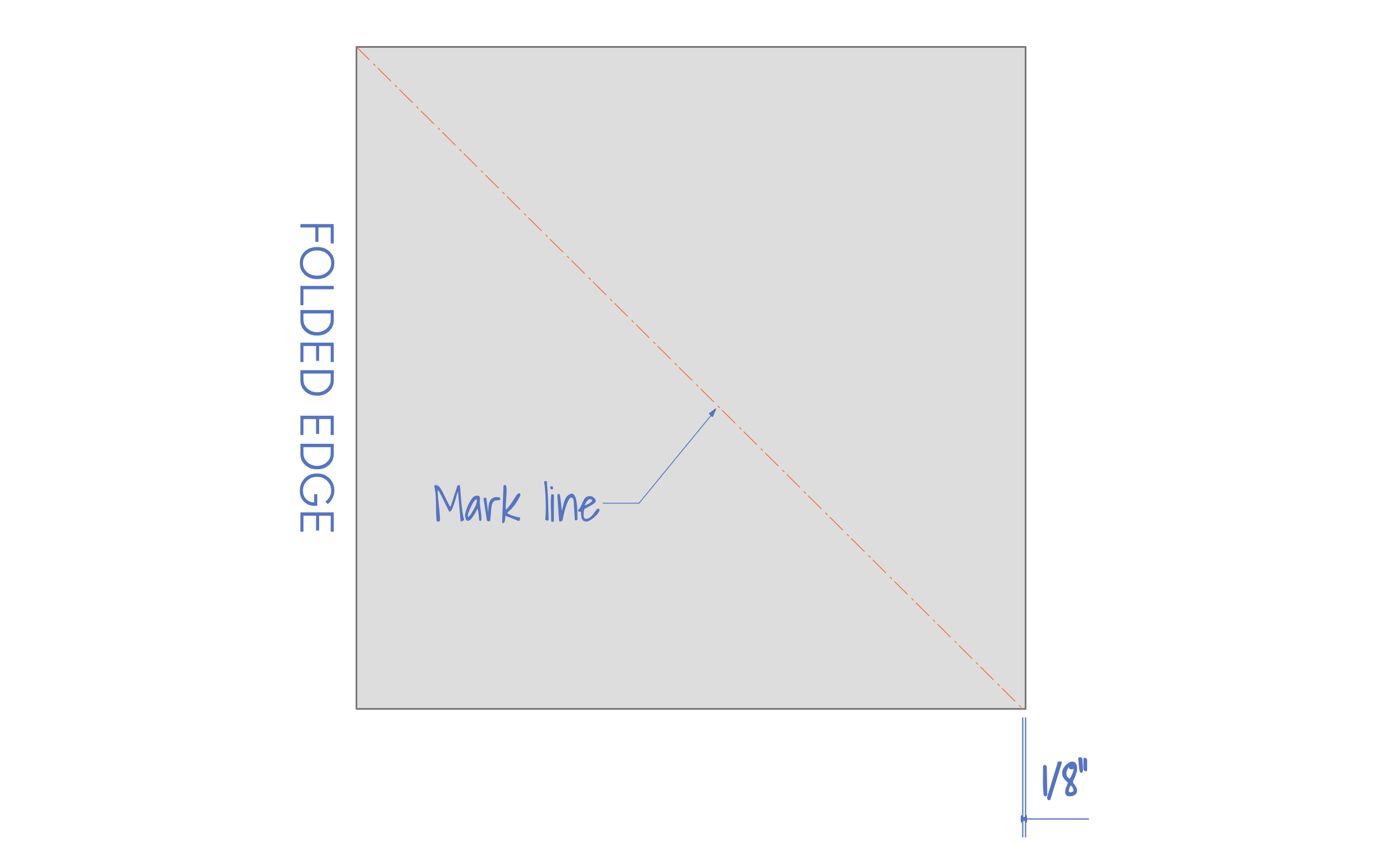 Cut a rectangle of fabric 12” x 6”. Fold the fabric in half so that short sides are aligned as shown below. Make a mark 1/4” down from the top on the folded edge as shown. Make a second mark 1/8” in from the right side as shown and mark a line between the two points. Cut along the marked line as shown.