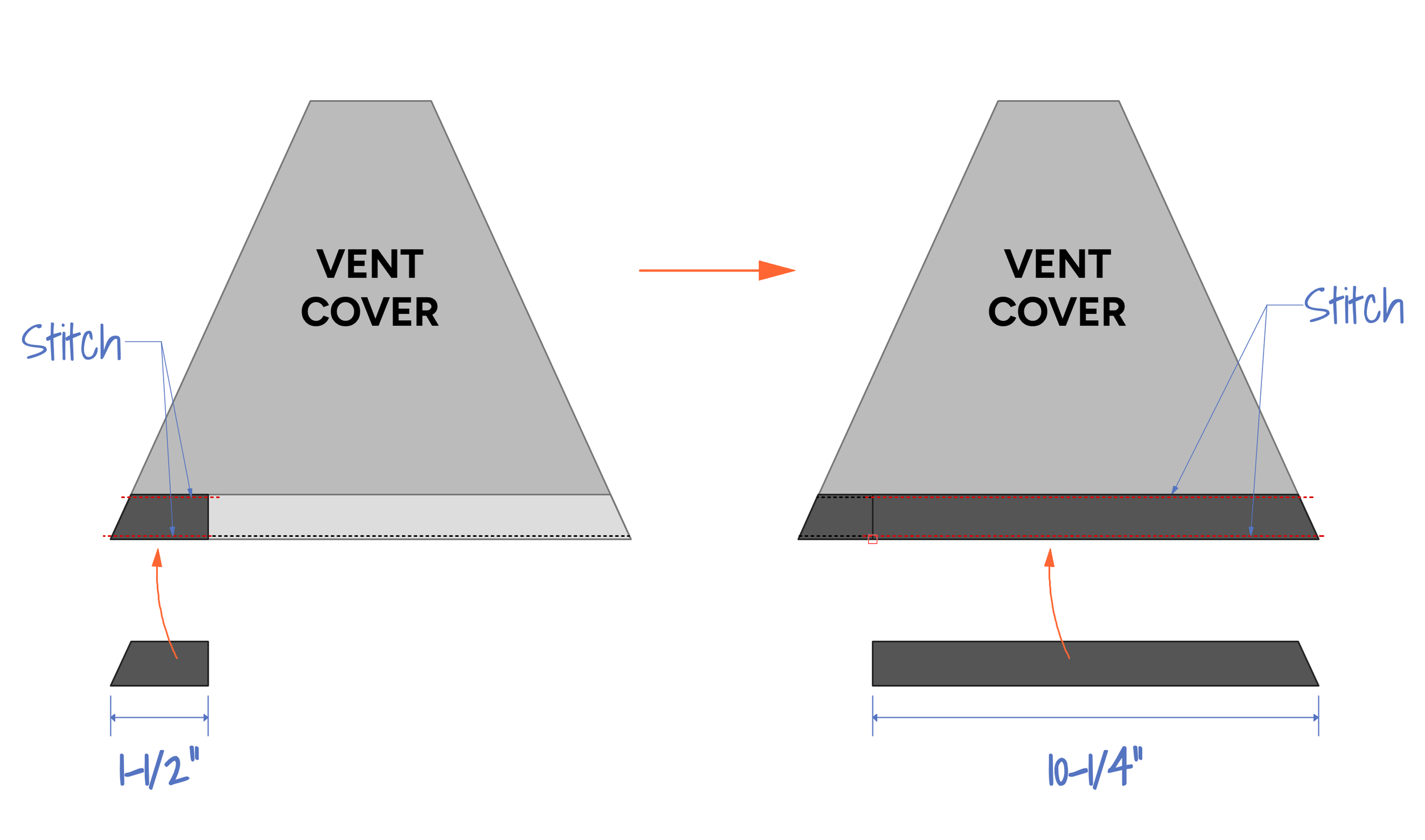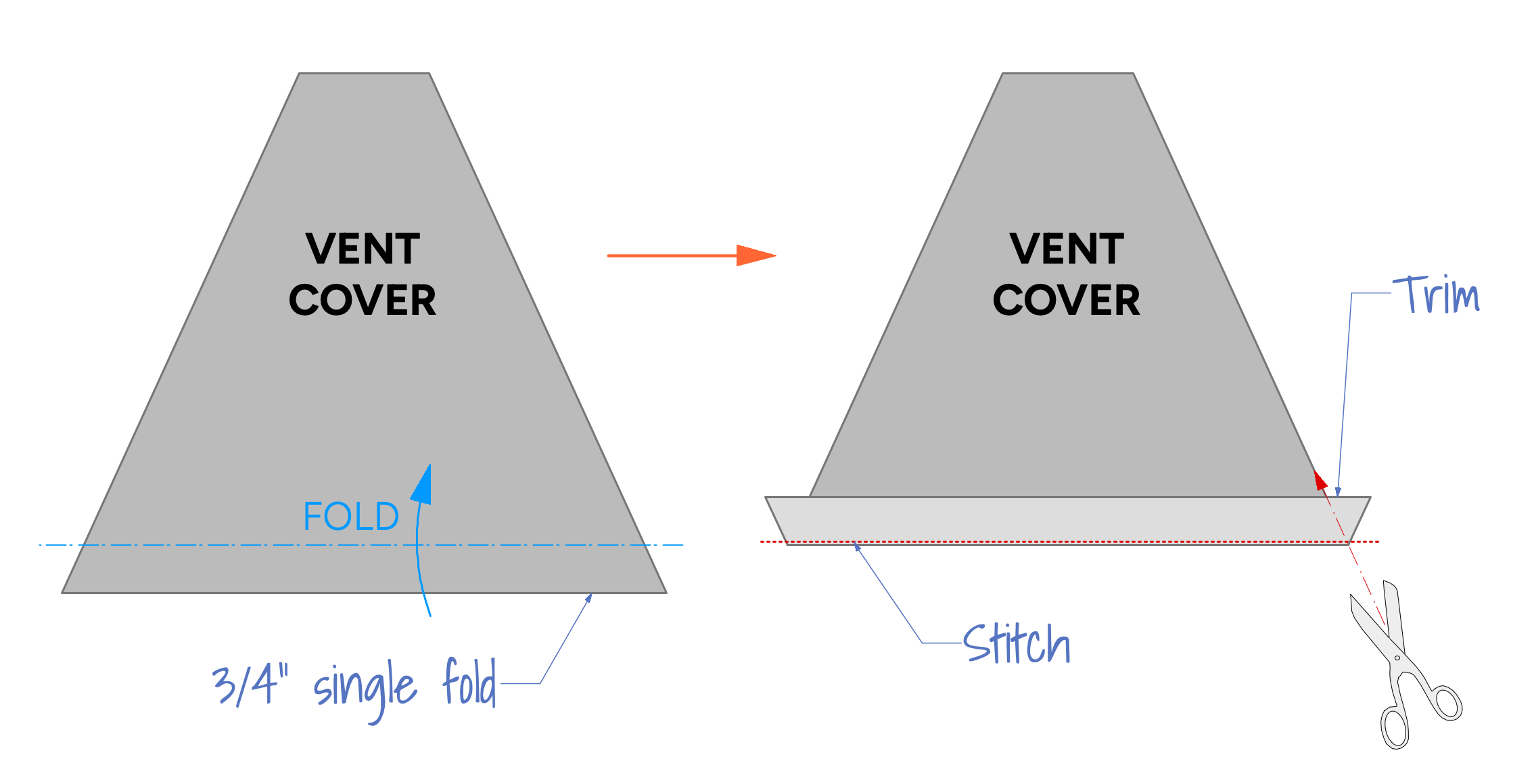 Make a ¾” fold on the bottom edge of the vent covers as shown below. Fold so that wrong sides are together. Stitch right next to the fold and trim the overhanging corners flush as shown below.