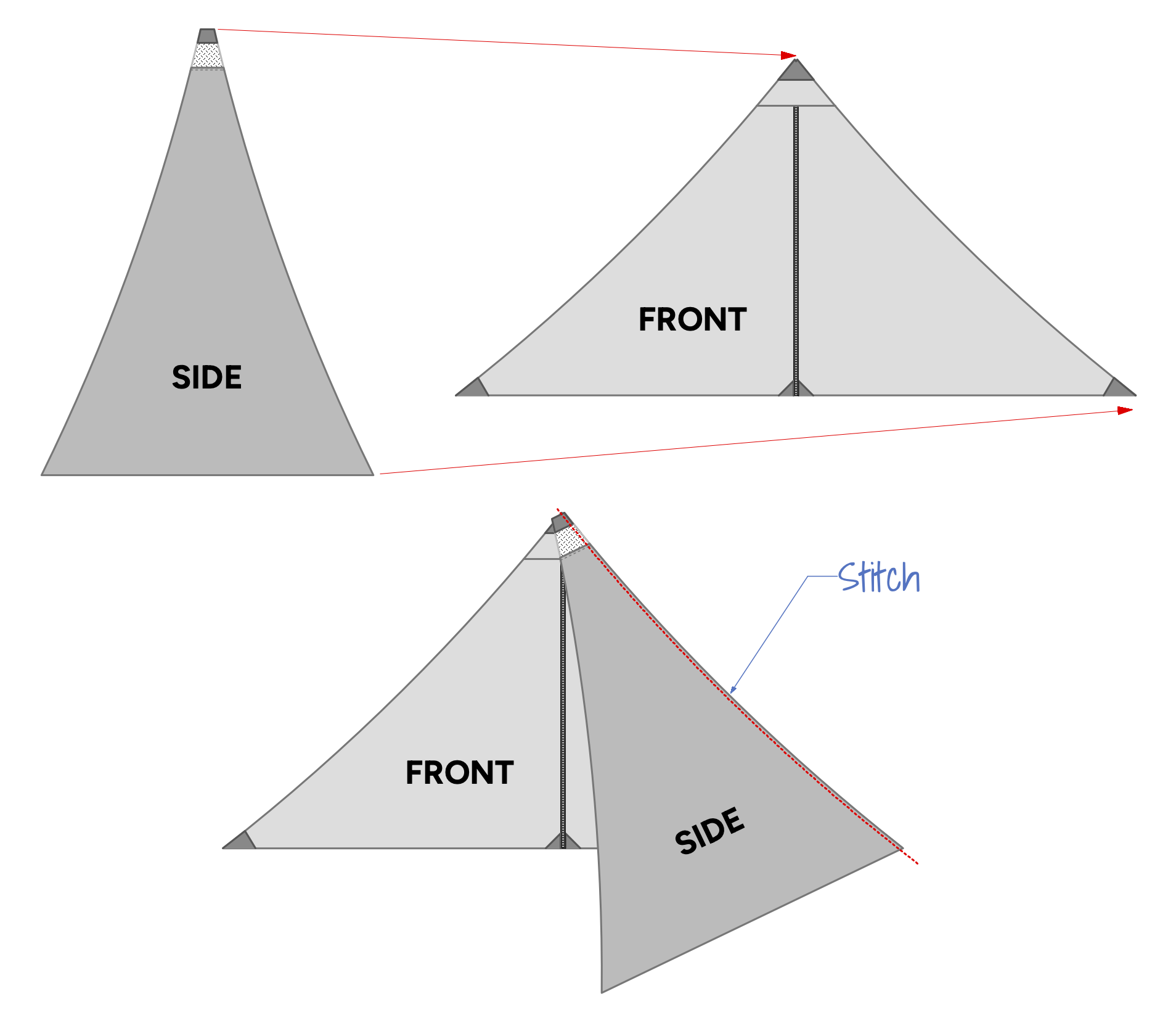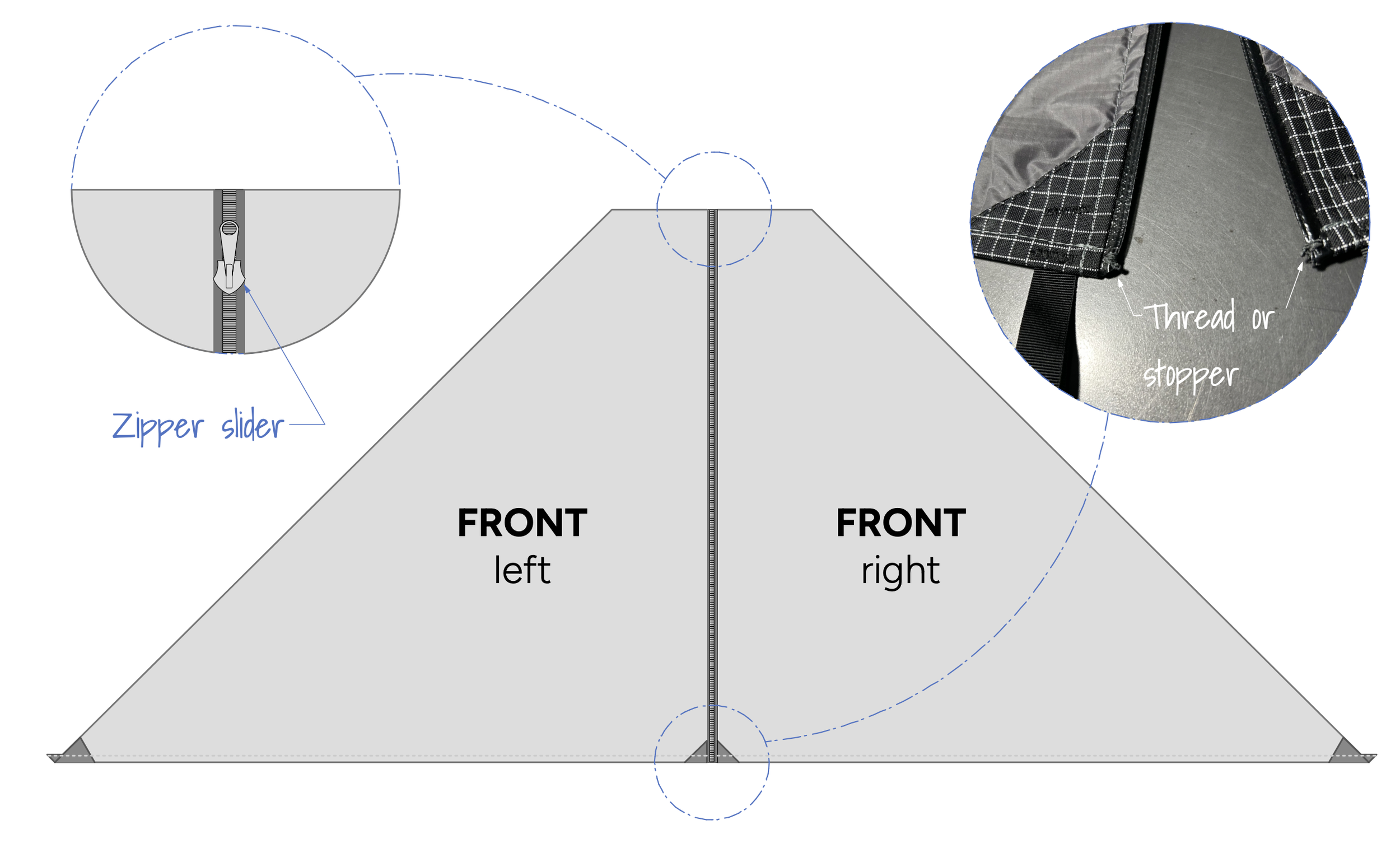 That said, time will tell how these seams hold up after extended real-world use. If I start seeing issues like elongating stitches, or failures under tension, I’ll update this article with what I learn and what I’d do differently next time. If you decide to build your own tarp with top-stitched French seams instead, just keep in mind that you’ll need to adjust the seam allowances of the parts shown in the diagrams accordingly.