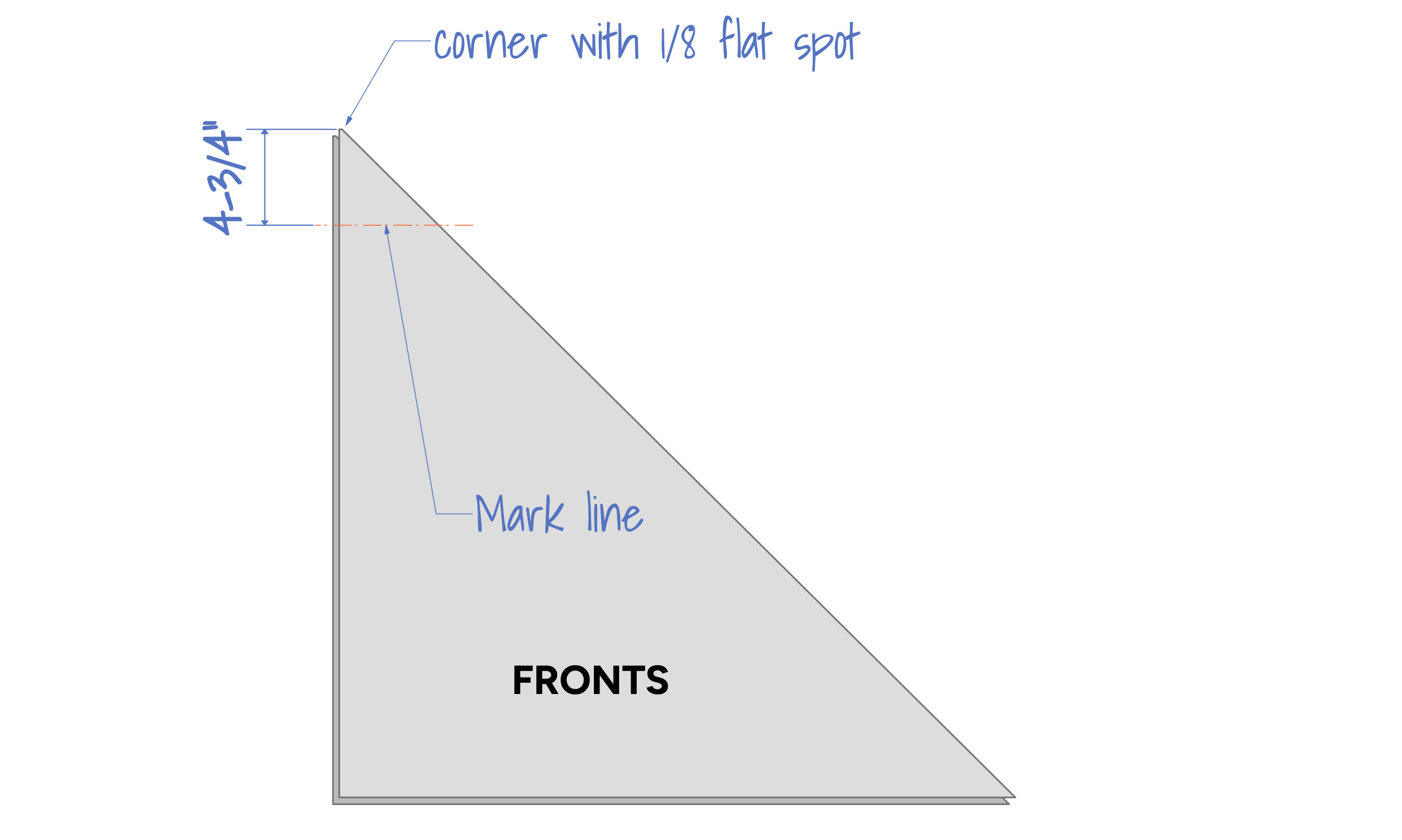Take the front panels and measure 4-¾” down from the corners with the ⅛” flat spot. Mark a line square to the edge as shown.