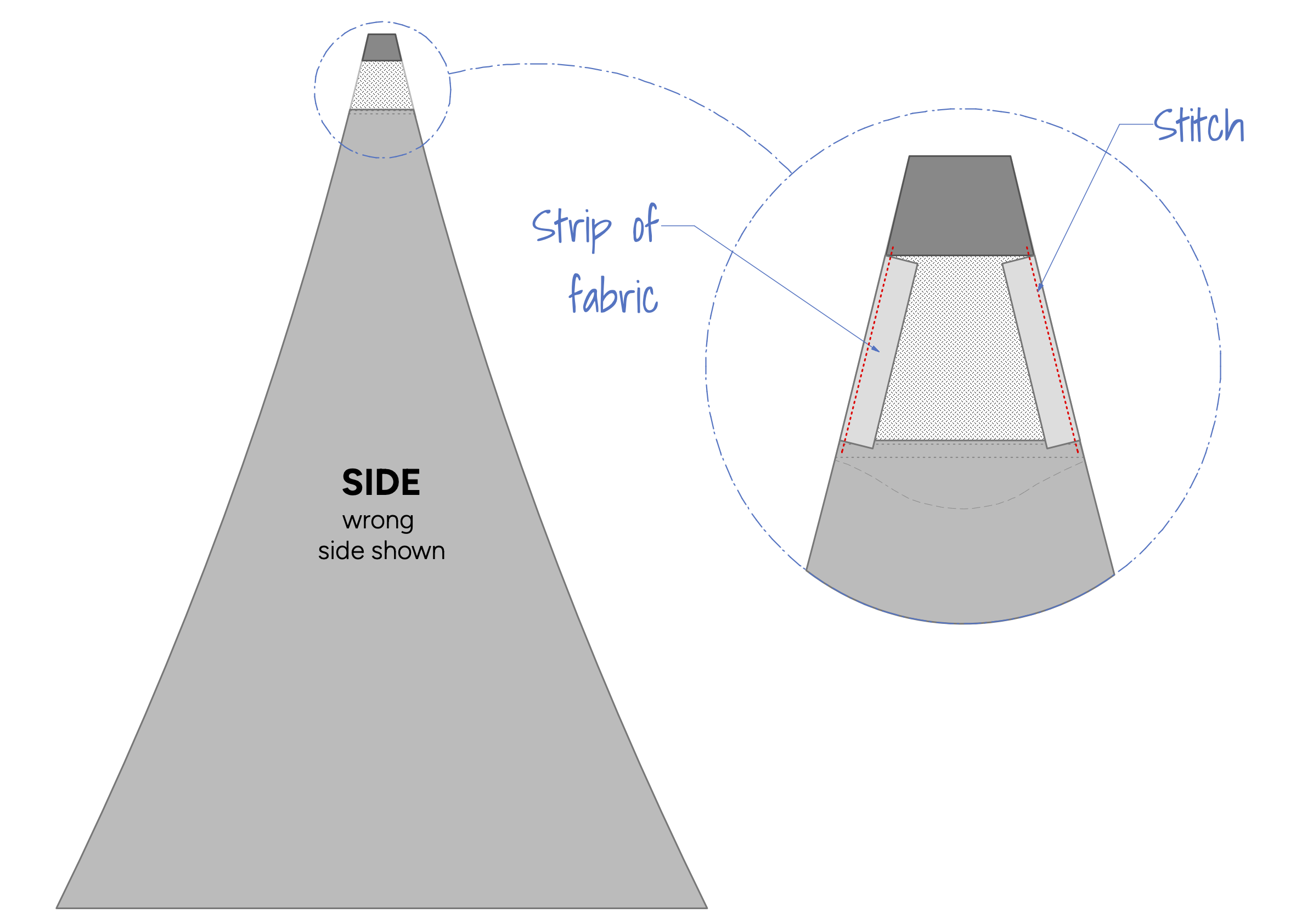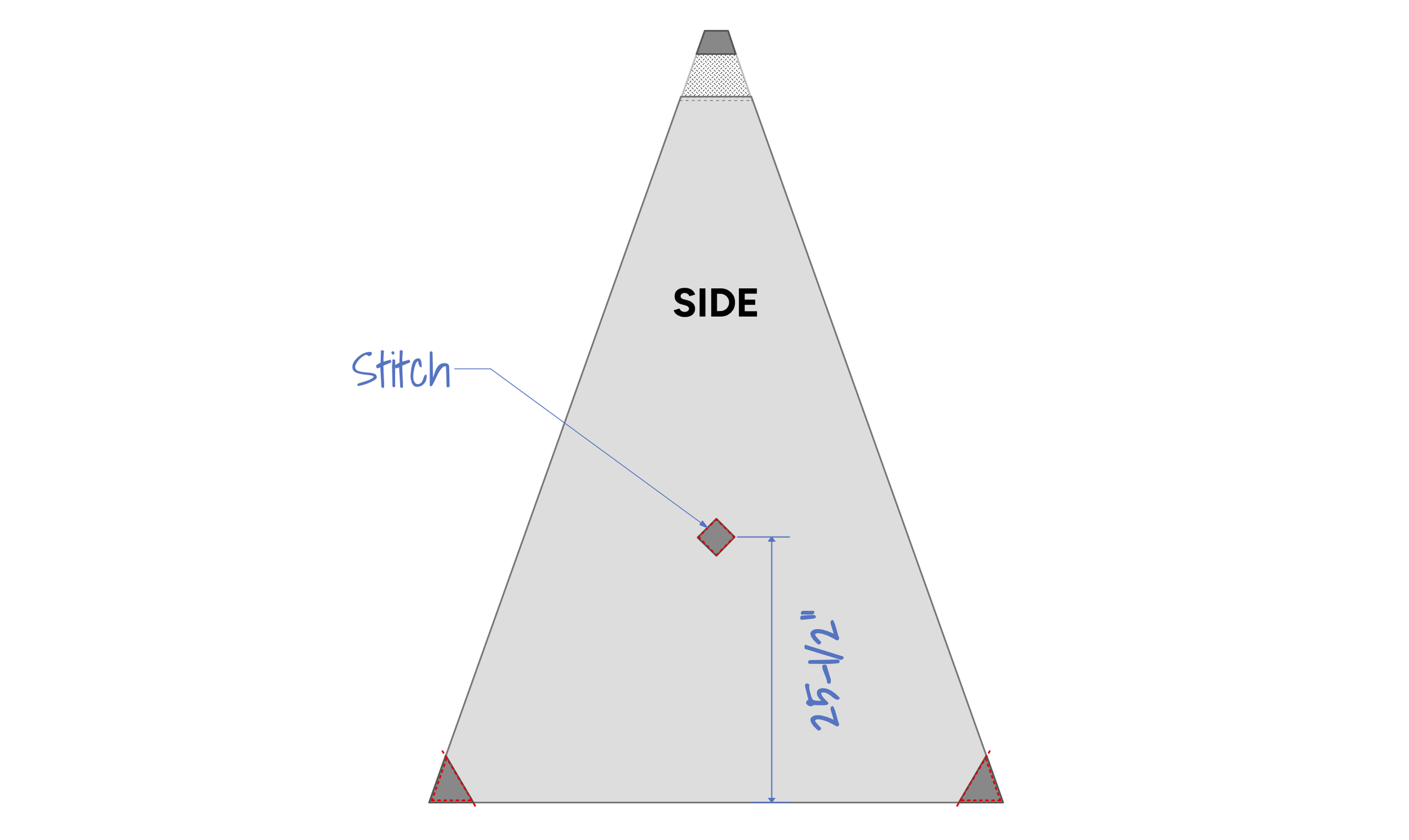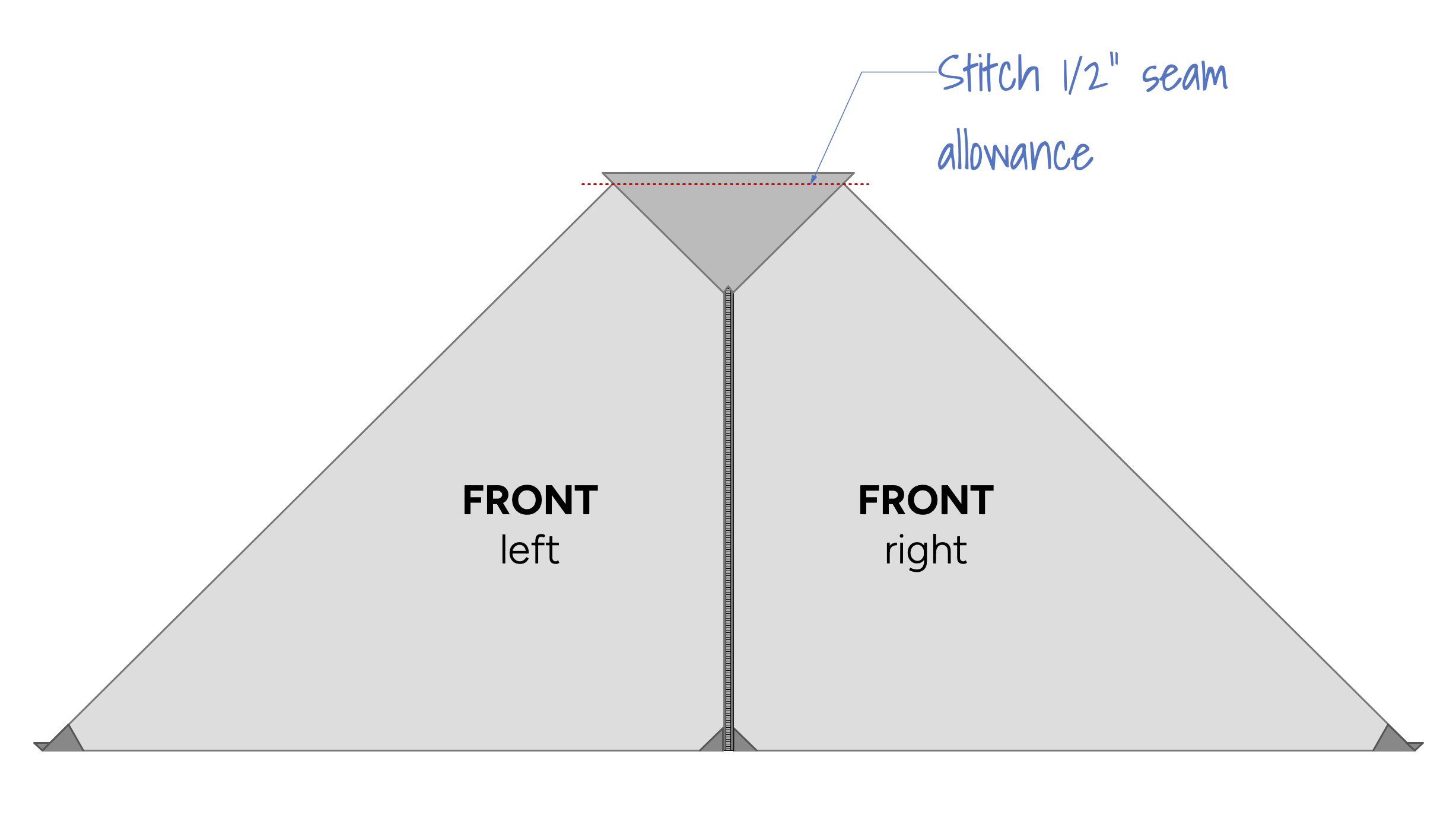 Continue this process with the other 3 main seams. Once all four main seams are done, stitch the peak of the pyramid with a 3/8” seam allowance as shown. I found it hard to apply the seam tape here, so I used seam grip to seal this seam instead.