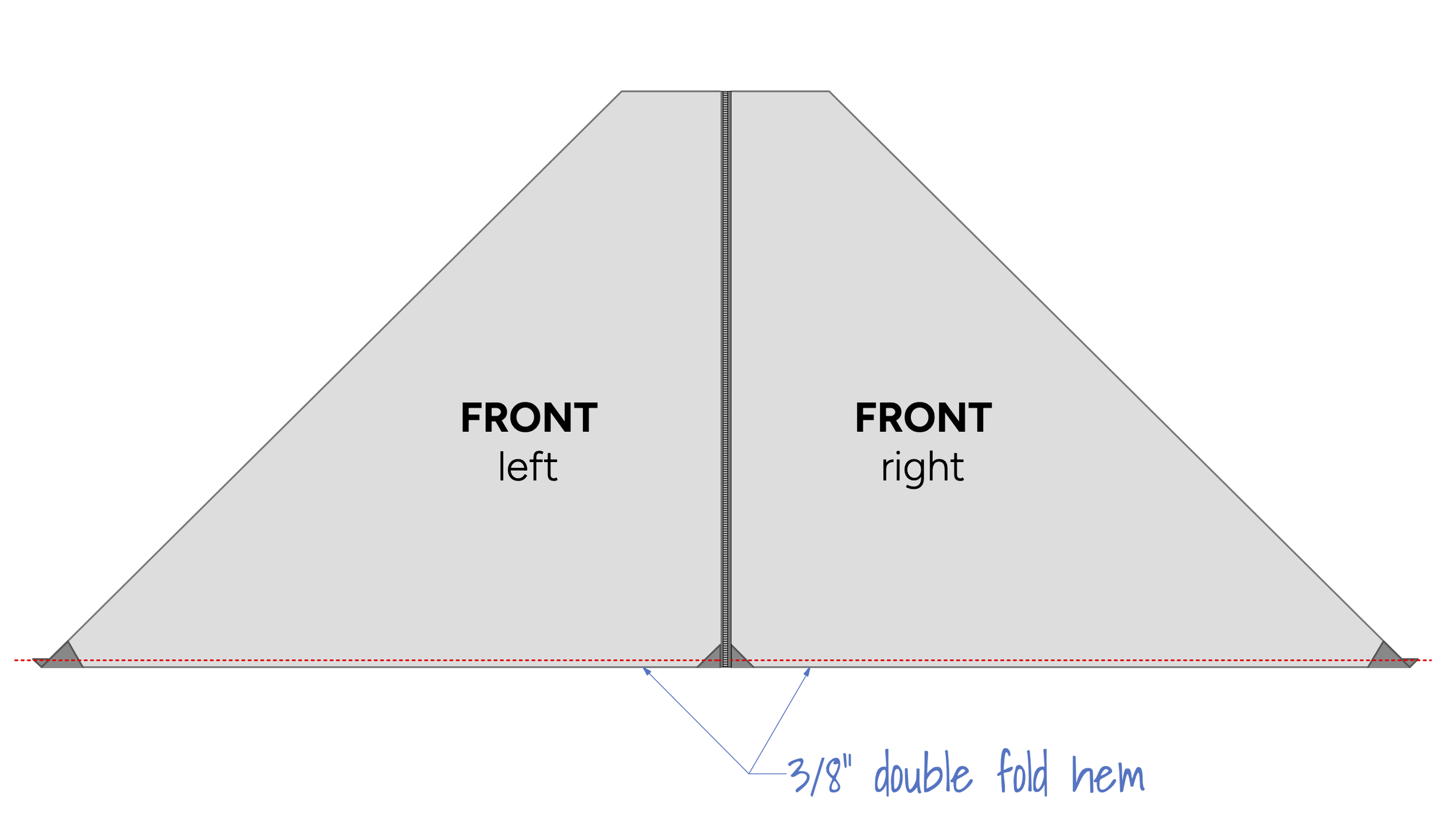Fold a ⅜” double fold hem on the bottom edge of the front panels and stitch in place as shown.