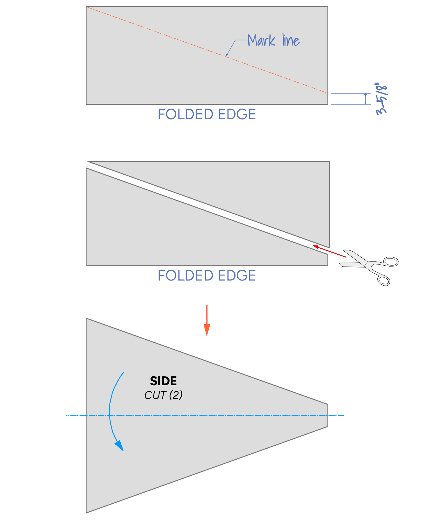 On one end, measure 3-⅝” up from the folded edge as shown and make a mark. Mark a line from the opposite corners to the mark as shown below. Cut along this line. The unfolded part is one of the side panels. You will need to cut 2 sides.