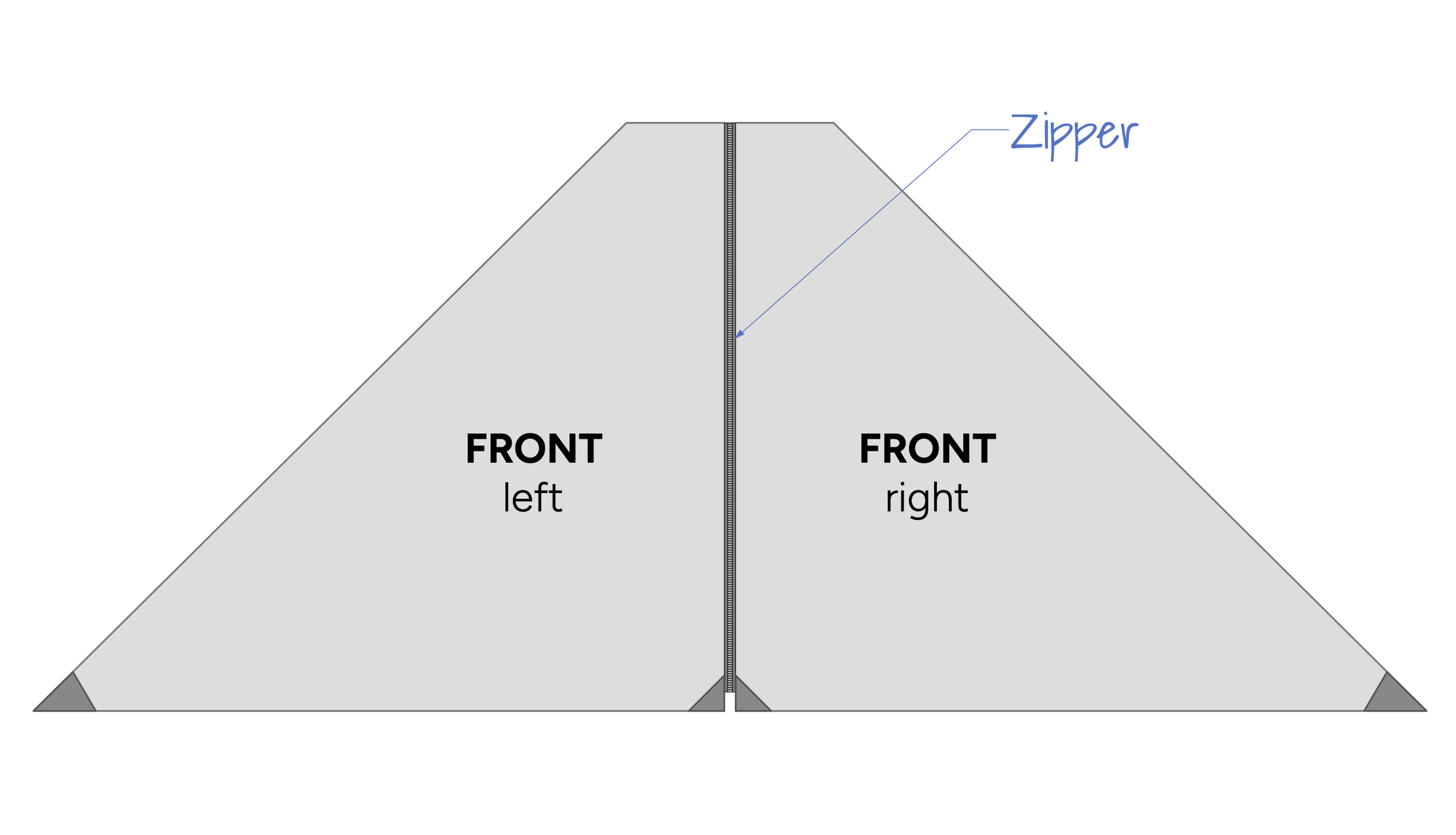 Install the 51-1/4” long zipper between the two front panels, using a 5/16” seam allowance. The zipper should be placed flush with the top of the panels as shown. The lower edge of the panels will hang past the zipper.