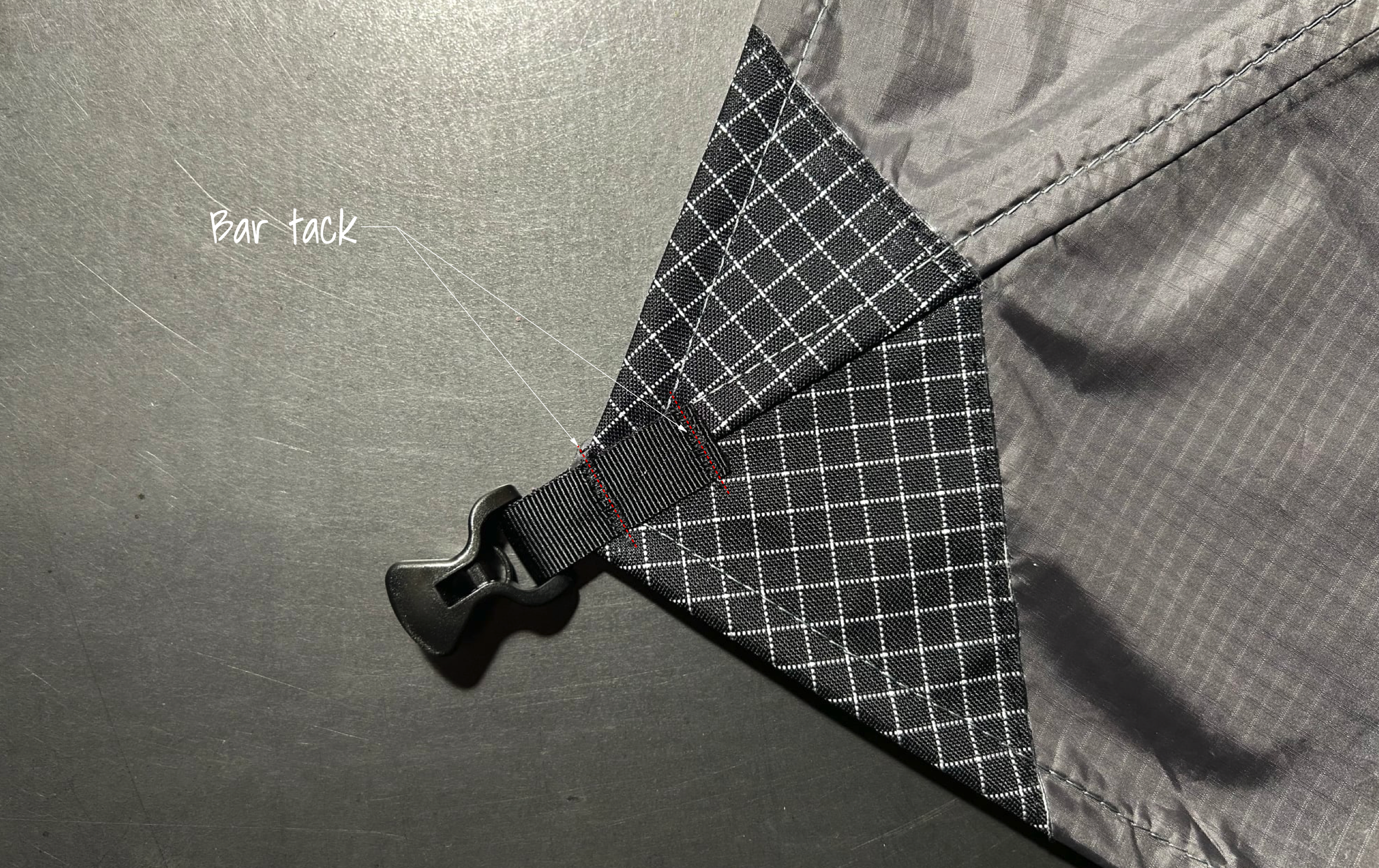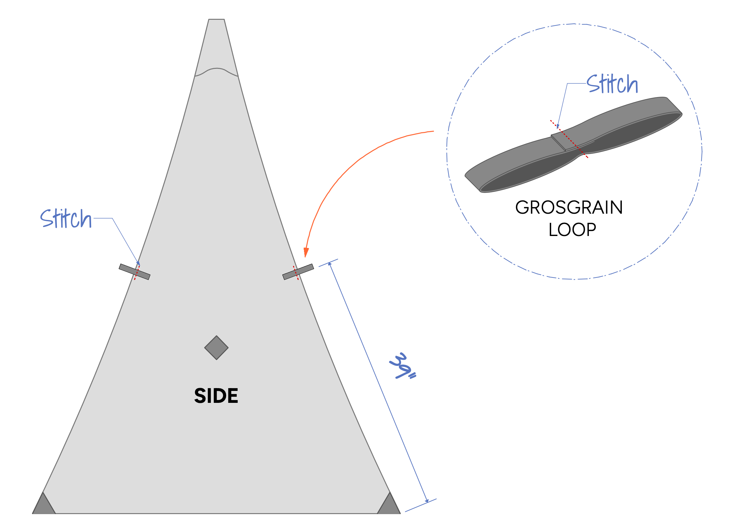 Take a 3” piece of ½” webbing or grosgrain and fold it in half forming a loop. Pin the loop to the guy-out reinforcement patch on the side panel. Stitch the loop in place with two bar tacks as shown below. Repeat on the other side panel and the back panel.
