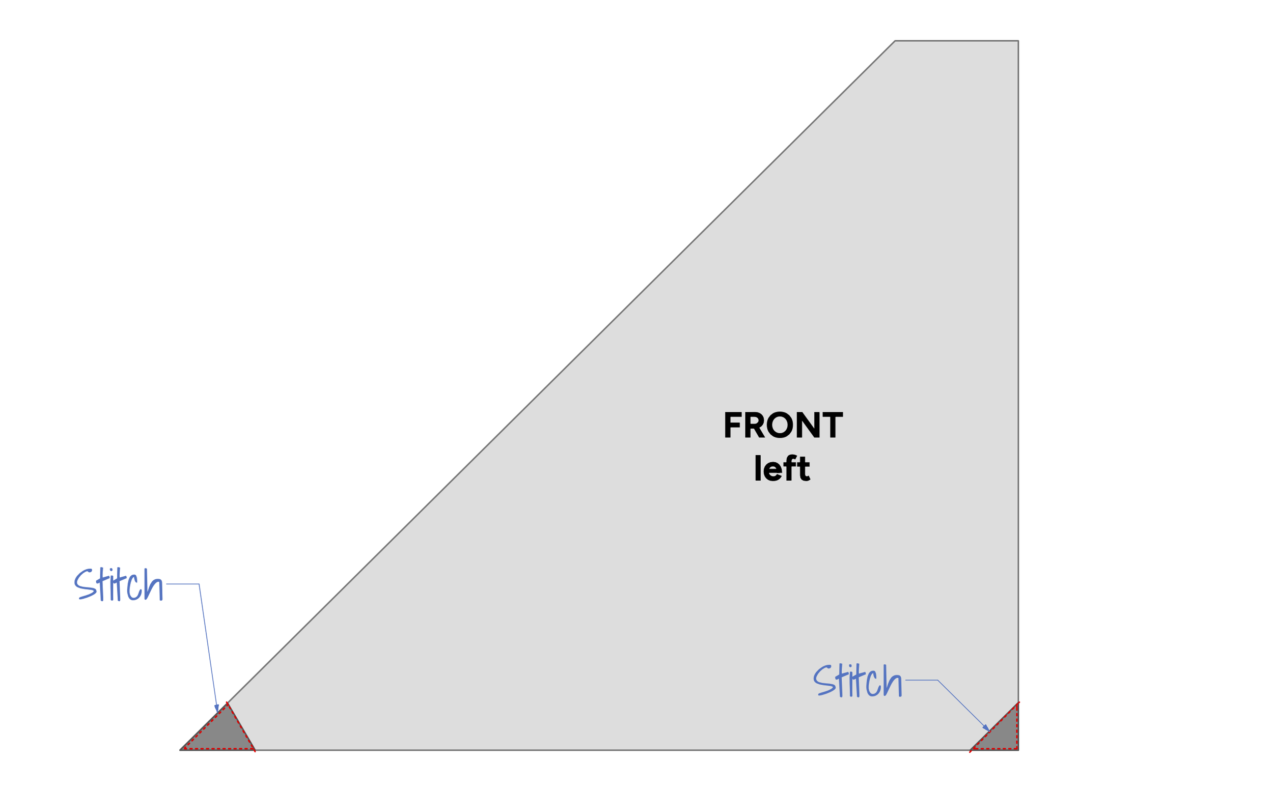 Stitch the lower reinforcement patches to the front panels as shown below. The edge of the patch that faces the interior of the panel should be stitched right next to the edge. The exterior edges can be stitched with a ¼” seam allowance. Repeat for both the left and right front panels.