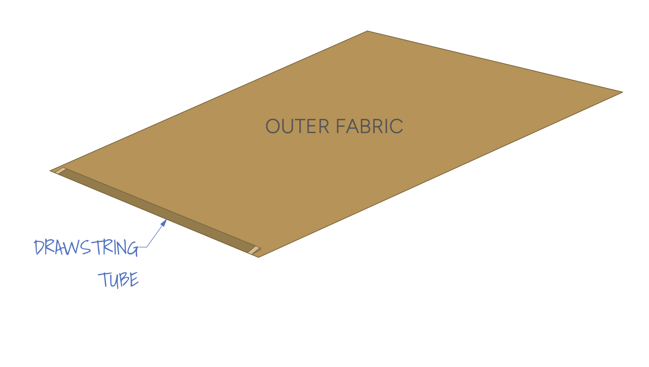 Pin the drawstring tube to the right side of the outer quilt fabric as shown below. The tube should align with the bottom edge of the fabric and be centered left to right as shown.