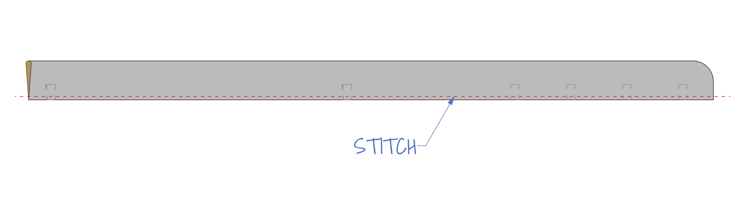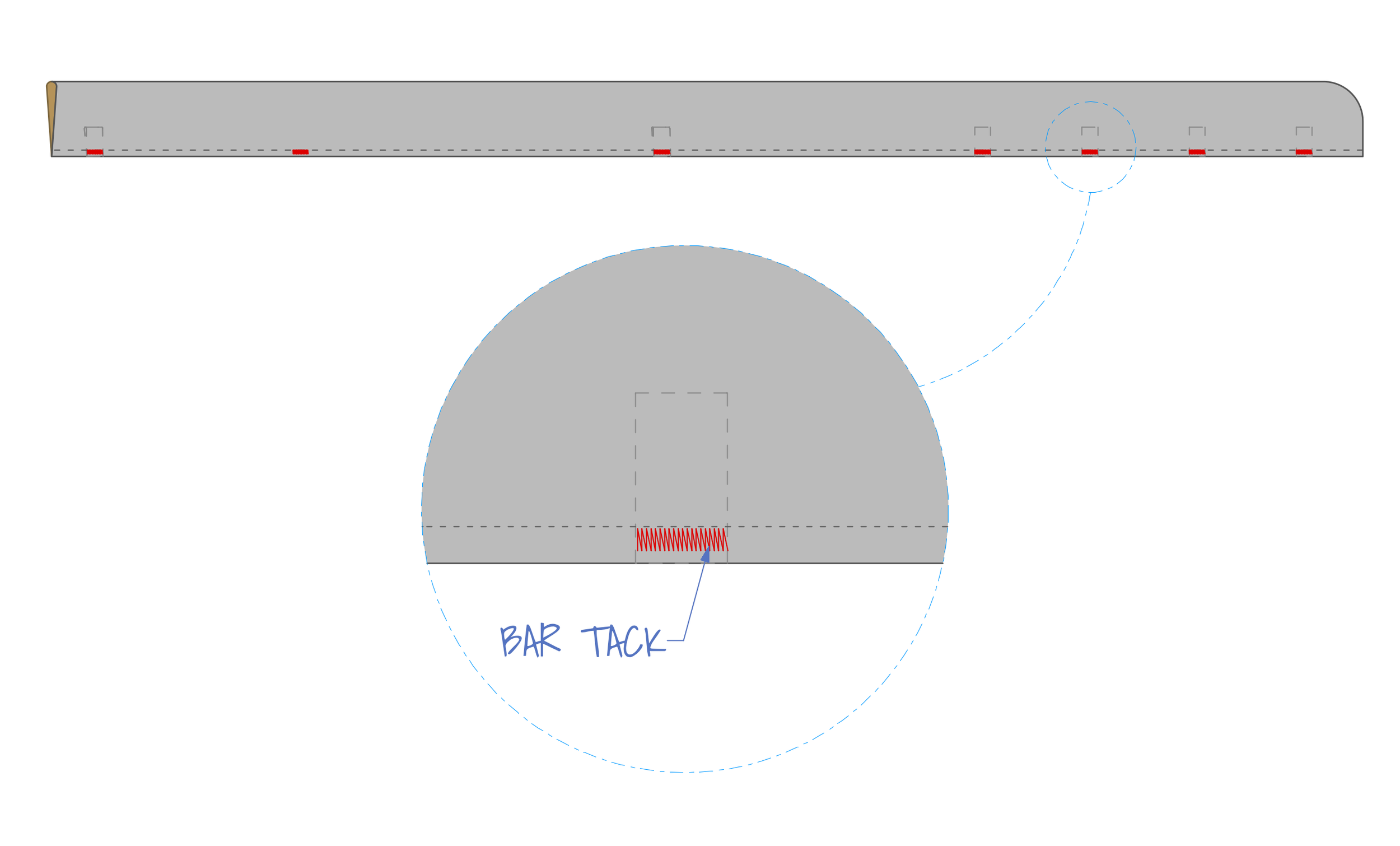 Stitch a bar tack at all of the locations where grosgrain attaches as shown below.