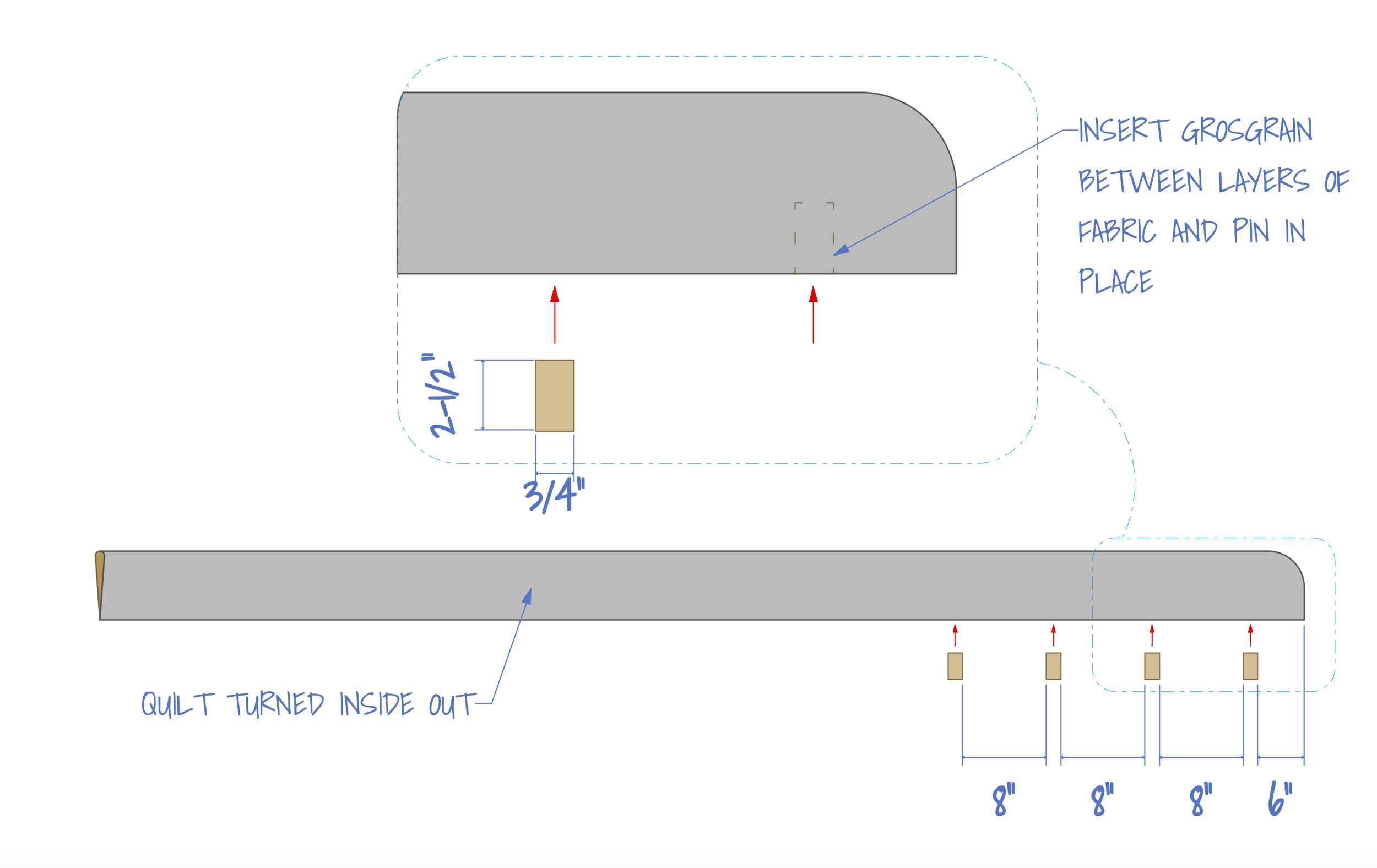I decided to use grosgrain tabs with snaps on them to form the foot box. To do this I took 1-1/4” long pieces of 3/4” grosgrain and pinned them between the layers of the quilt. I wanted a tall foot box so I used 4 pieces of grosgrain spaced out at the dimensions shown below. (If a zipper is preferred over snaps, it could easily take the place of the grosgrain.)