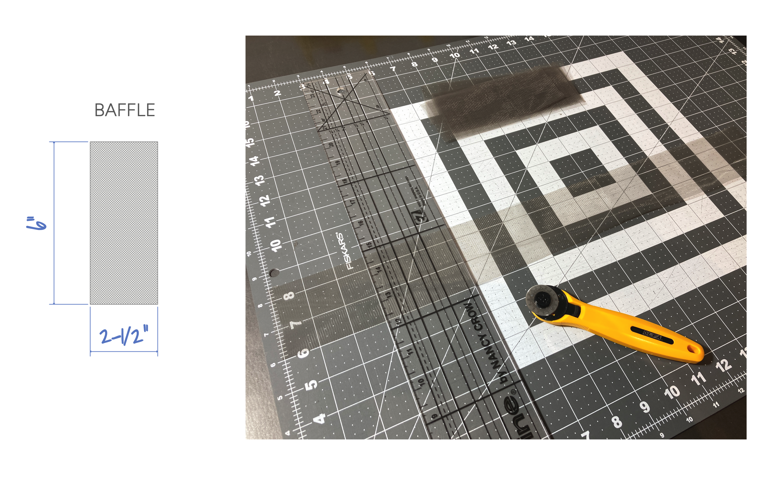 Cut the baffles to size. In my case I needed 36 baffles, each 2-1/2" x 6". A rotary cutter and cutting mat with dimension markings is helpful for this step.