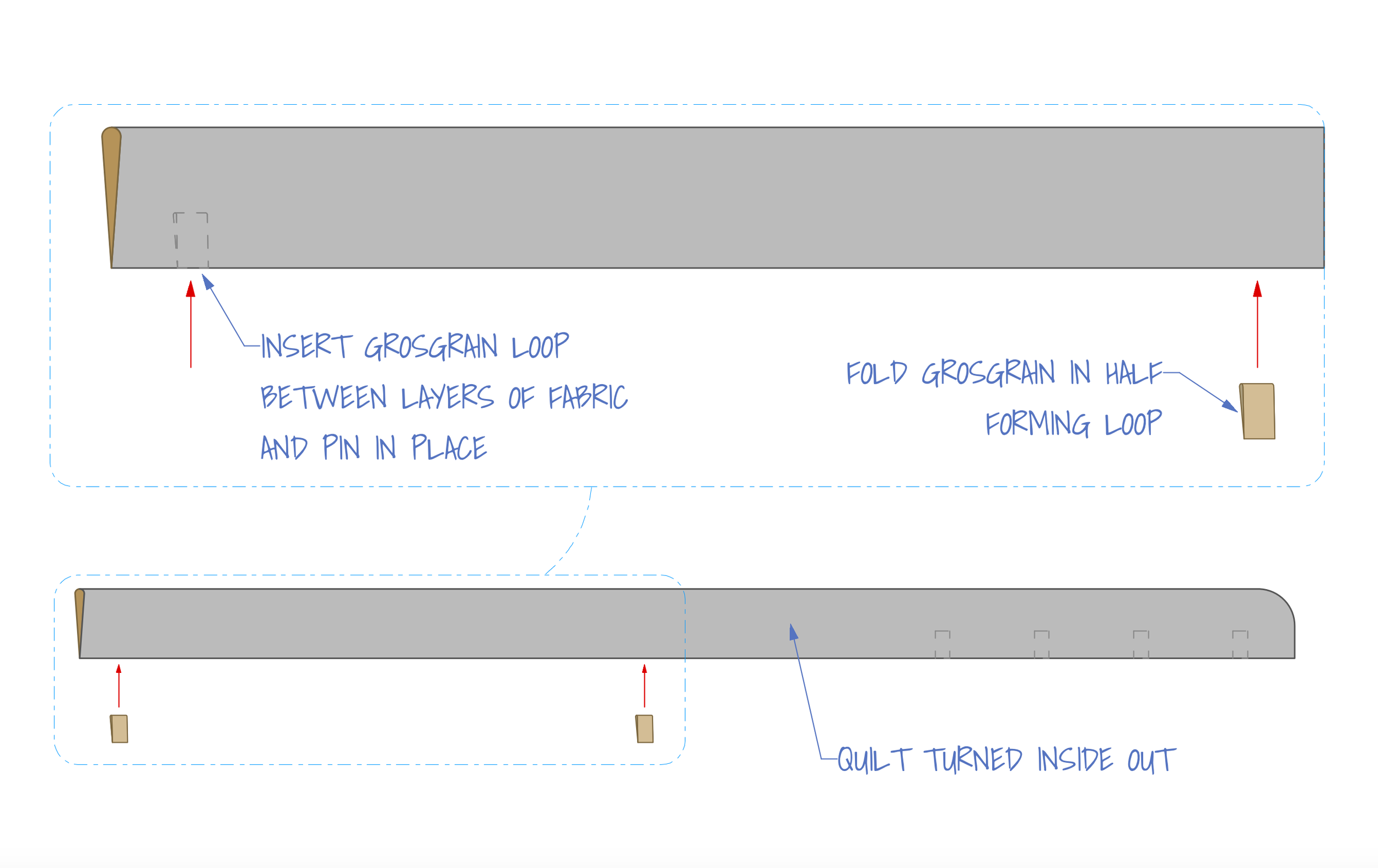 The next step is to pin whatever loops or buckles you plan to use for pad attachment between the layers of the quilt. I added loops of grosgrain that can be used for attaching cord if desired. I pinned one at the top of the quilt and the other about halfway between that and the first snap.
