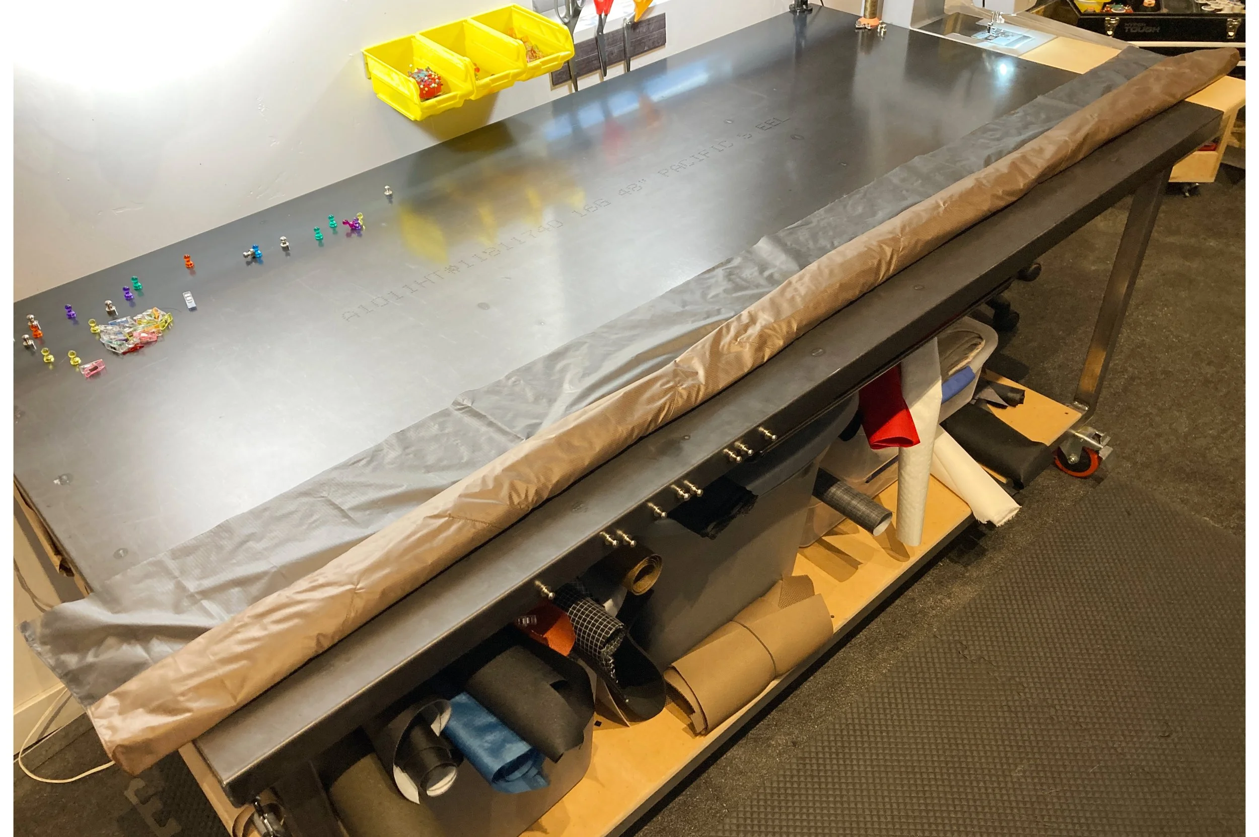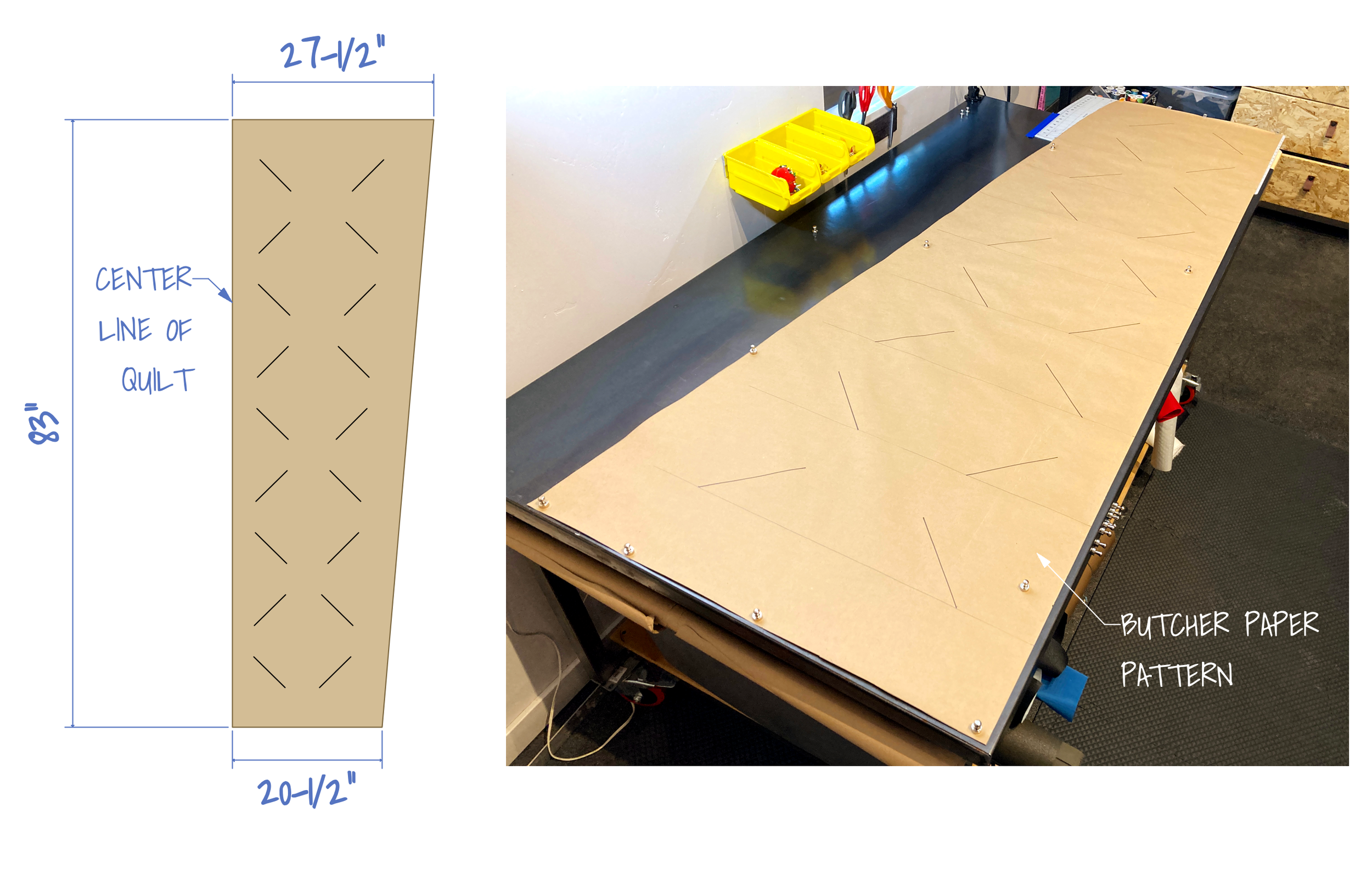 Although you could measure and mark the baffle locations directly onto the fabric, I figured it would be faster and more accurate to create a full scale pattern that could be used to both cut out the shape of the fabric, and mark the baffle locations. I made this pattern from butcher paper. The pattern was made for only one half of the quilt using the straight edge of the butcher paper as the centerline of the quilt. After cutting the butcher paper to size, I measured and marked out the baffle locations based off of the layout I had done on the computer.