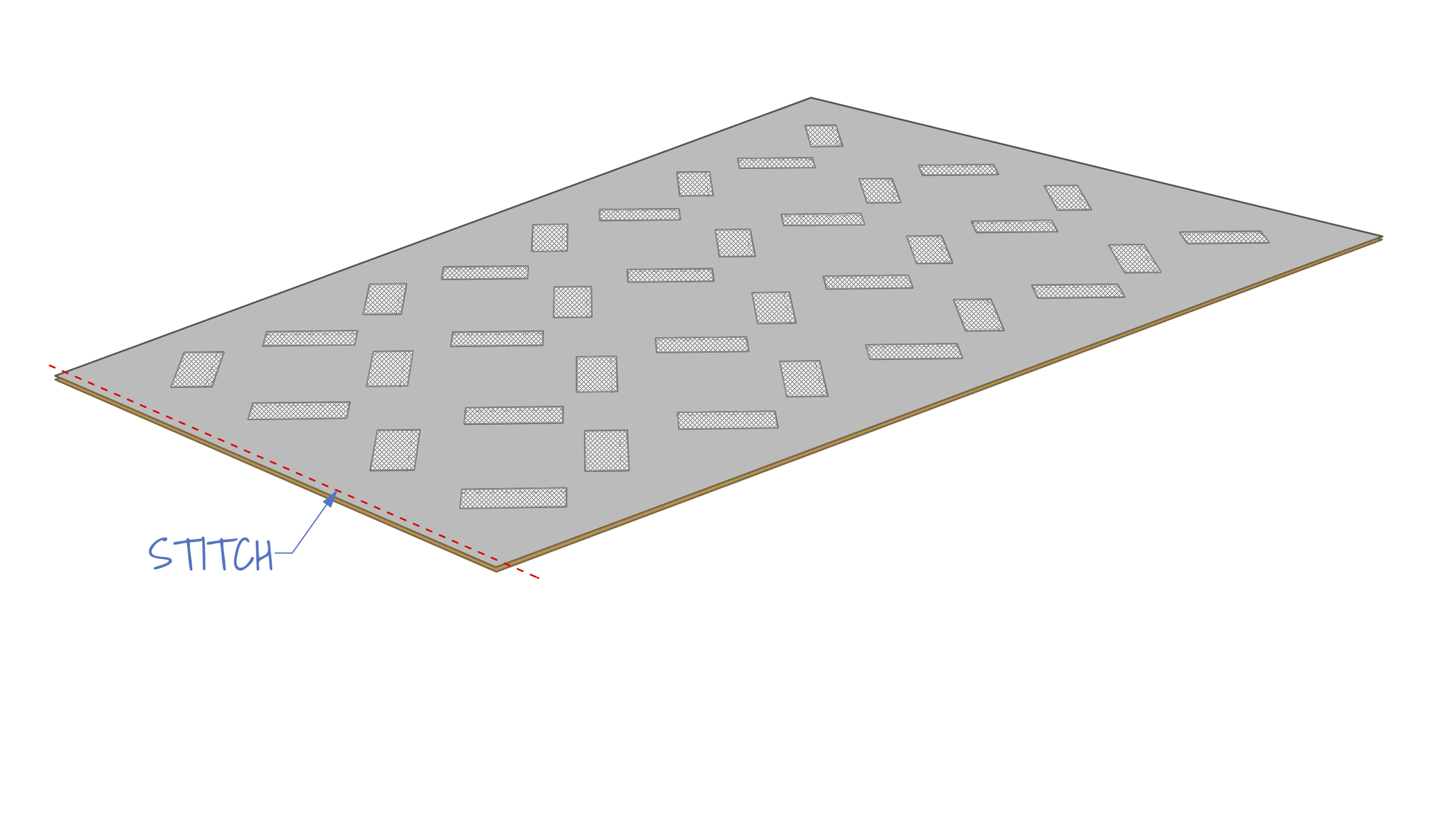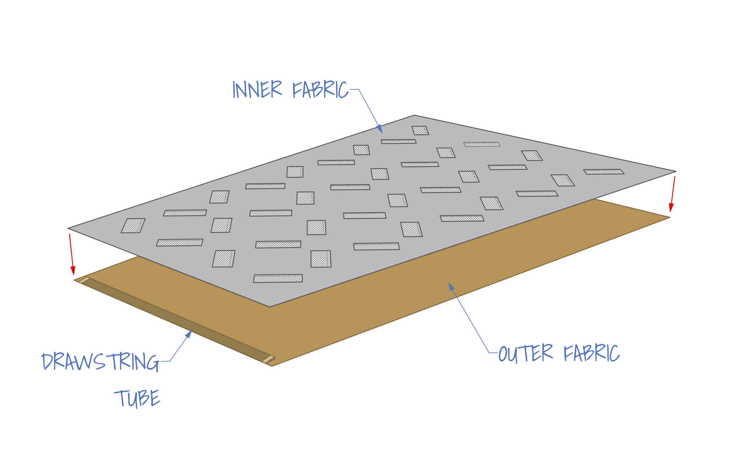 “Karo Step” construction is a type of baffle construction. It has the same advantage as baffle box construction in that the cold spots are eliminated. But, rather than use long strips of baffle material to form channels, short sections of baffle material are used to form smaller compartments as shown above. This can make for a lighter quilt because less baffle material is used. (Depending on the baffle layout.) In this method, each compartment is open to the compartment next to it. This makes filling the quilt with down much easier, as all of the down can be added at once and then distributed throughout the quilt. It can even be distributed so that there is more down in the compartments at the top of the quilt where it is needed more, and less along the edges where it’s not. But, this strength is also its weakness, because it means that the baffles do not completely control the down and it can migrate from compartment to compartment with use. How much the down moves depends on the size of the compartments and baffles, as well as how full of down the quilt is.