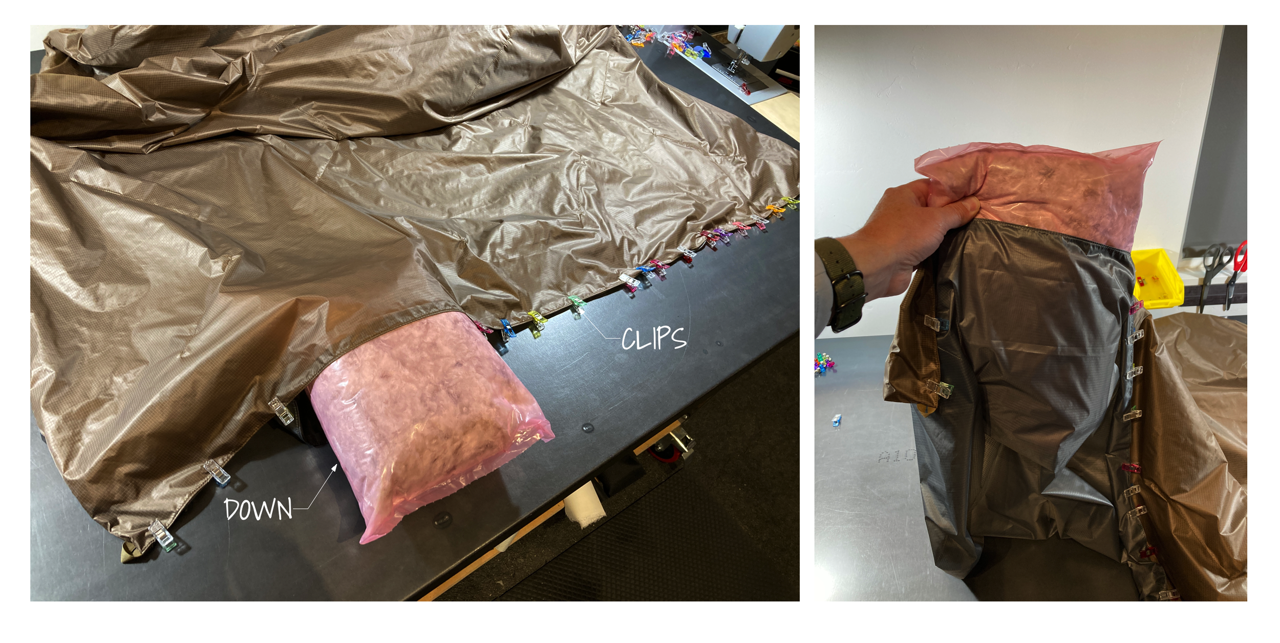 Fill the bag with the down. This is where one of the biggest advantages of the Karo Step baffle method comes into play. Instead of filling each compartment individually as you would with box baffles, here all the down can be filled through the top and then distributed to the different compartments. This makes filling the quilt much easier. The down I used came in 3 oz bags. I used clips to seal the top edge of the quilt leaving an opening just big enough for a bag to fit, and then just dumped the down into the opening as shown below. shaking the quilt helped distribute the down and make room for the next bag.