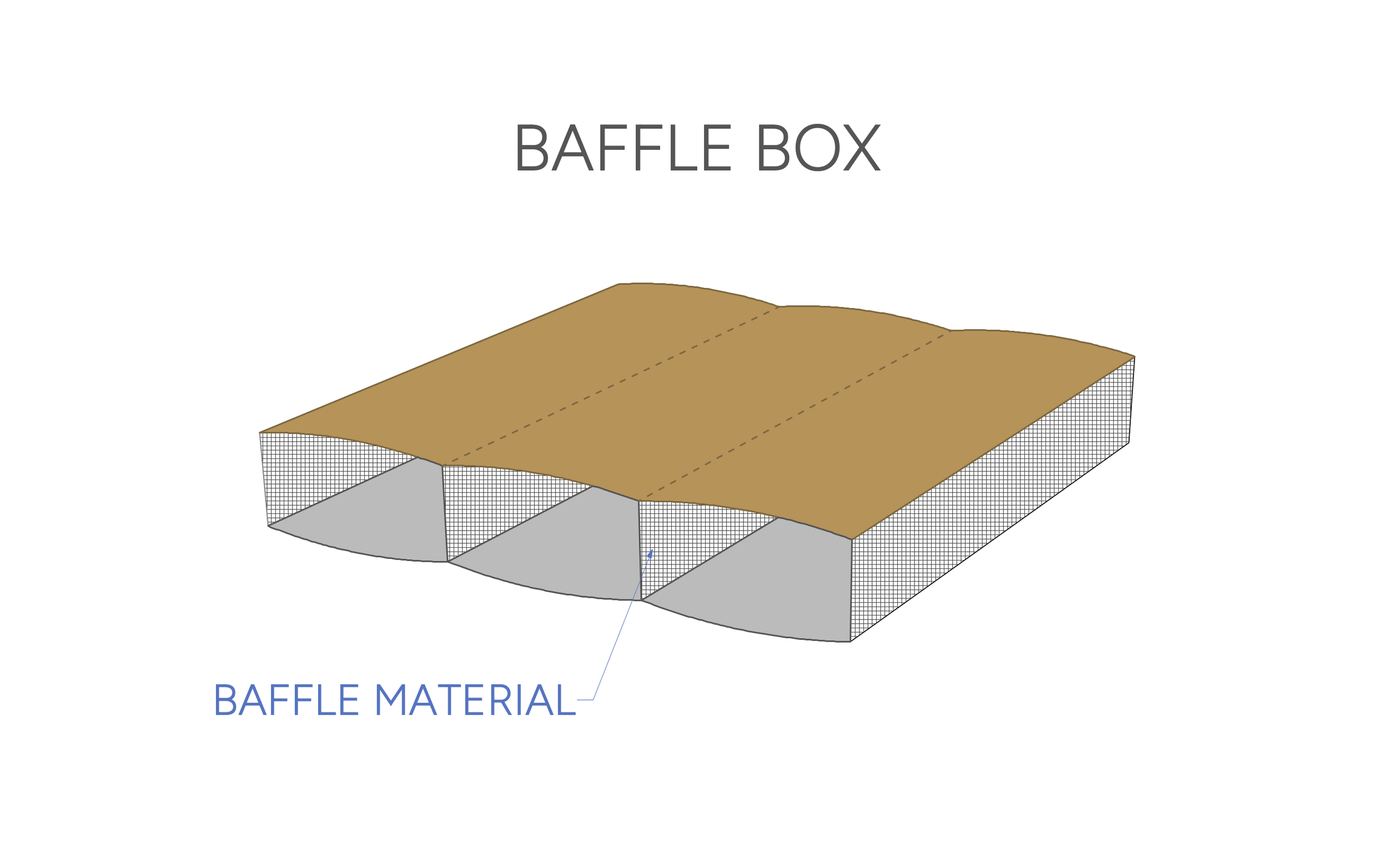 In “Baffle Box” construction a strip of fabric (usually no-seeum netting) is sewn to the inner and outer layers of the quilt forming a box shape. This eliminates the cold spots created with sewn through construction. It also allows the down to loft to its full potential. These baffles generally run across the quilt either horizontally or vertically, creating long channels that are individually filled with down. This type of construction does a good job at minimizing down movement, but filling the individual compartments can be tricky and time consuming.