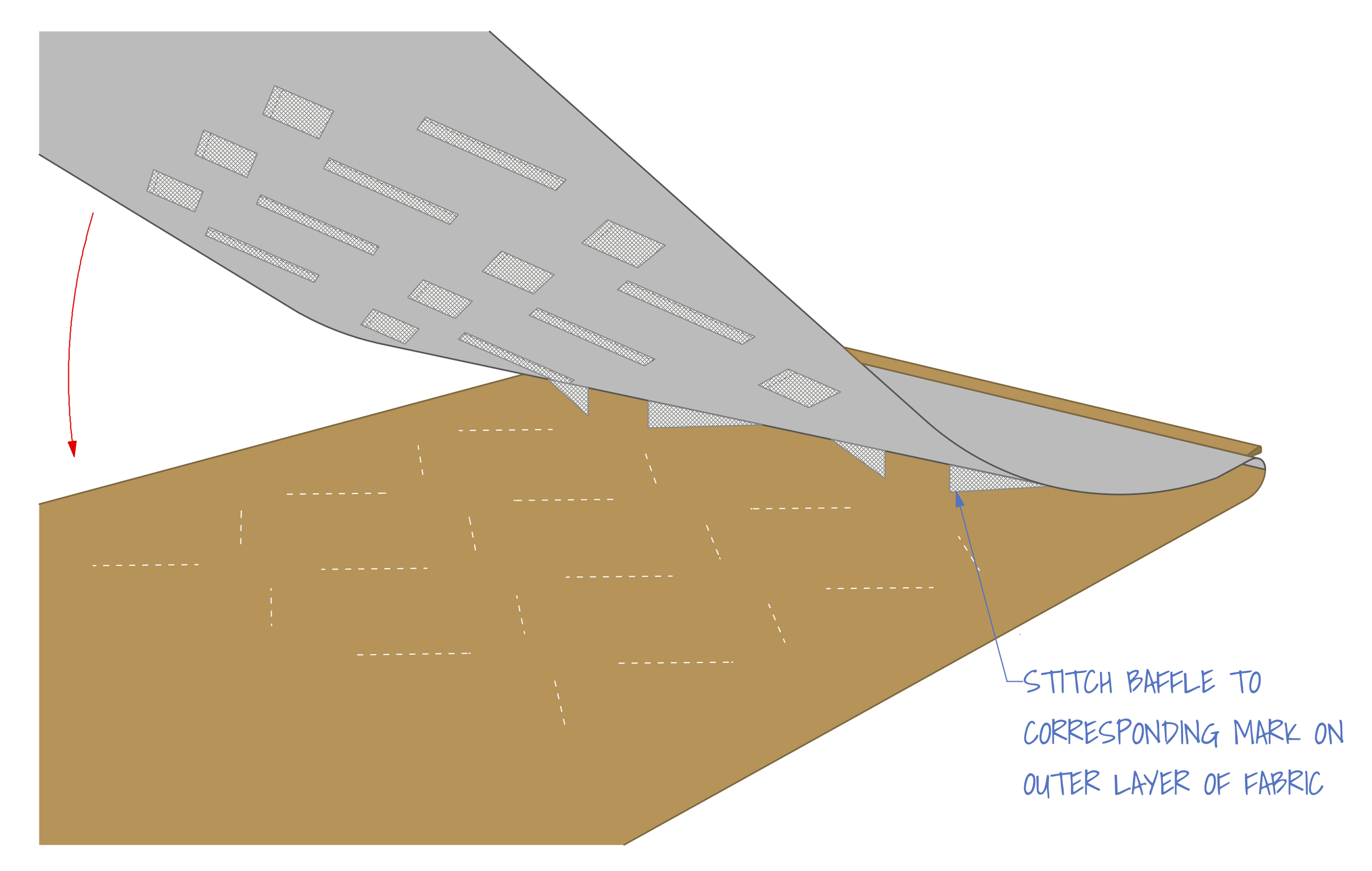 Fold the parts so that the inner and outer layers are wrong side together. Starting at the bottom of the quilt, align the baffles from the inner part with the corresponding marks on the outer part. Use tape to hold the baffle in place and stitch along the line following the same procedure used previously.