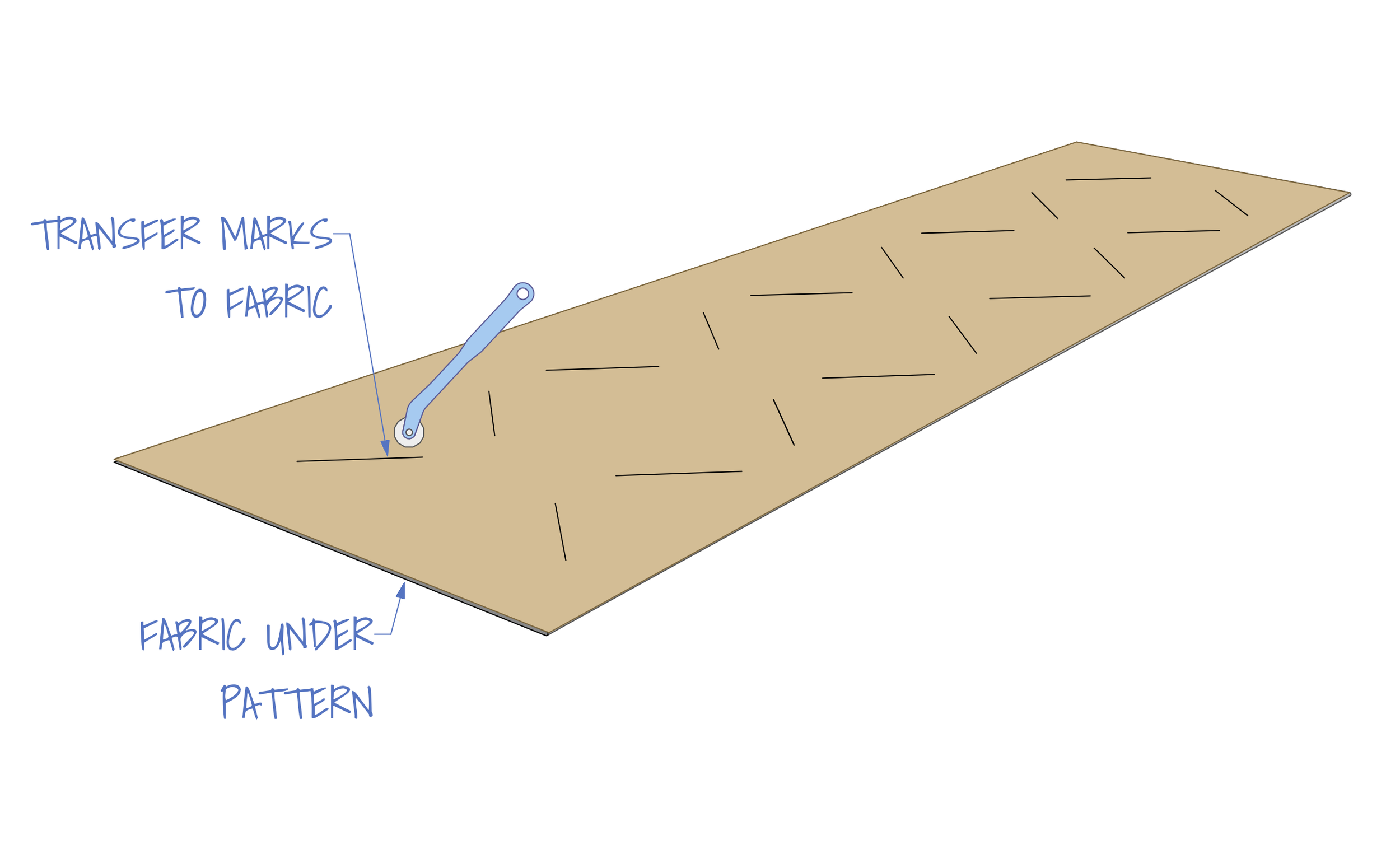 Use marking paper and a tracing wheel to transfer the baffle marks from the pattern onto the fabric. (Marks should be transferred to the wrong side of the fabric.) Both halves of the part can be marked at the same time by folding a piece of marking paper so that the chalky sides face out, and inserting it between the layers of fabric.