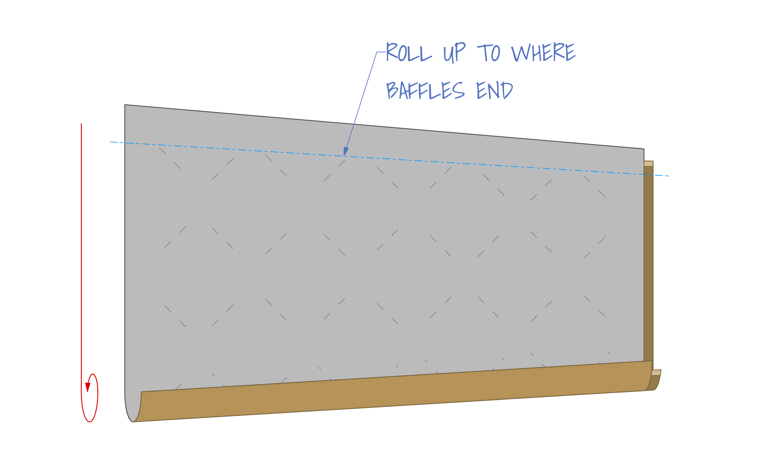 Once all of the baffles are stitched to both the inner and outer layers of the fabric, it’s time to stitch up the sides. Roll the quilt up along its length as shown below.
